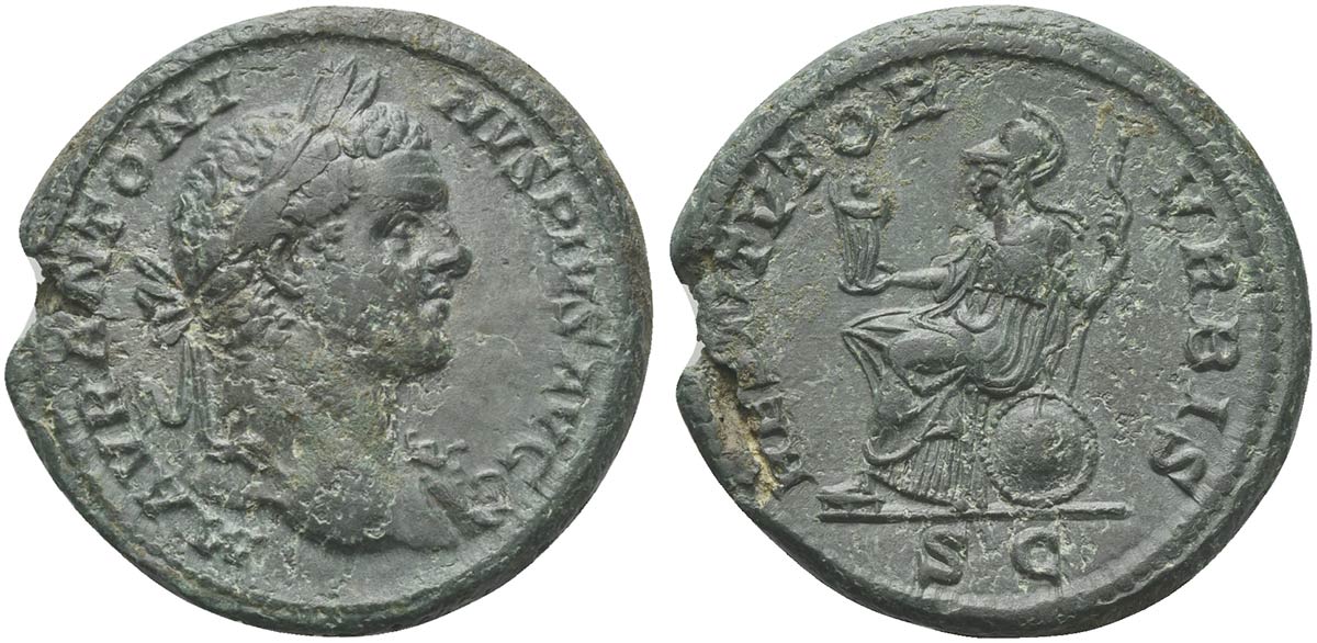 Caracalla (198-217), As, Rome, 202-210. AE (g 11,91; mm 27; h 6). M AVR ANTONI-NVS PIVS AVG, Laureate bust r., wearing aegis, Rv. RESTITVTOR VRBIS, Roma seated l., holding victory and spear; shield beside her. RIC 475 var. (obv. legend). Scarce, very fine
