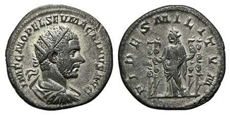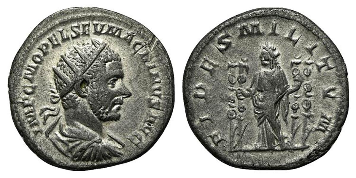Macrinus (217-218), Antoninianus, Rome, AD 217. AR (g 5,21; mm 22; h 12). IMP C M OPEL SEV MACRINVS AVG, Radiate, draped and cuirassed bust r., seen from behind; Rv. FIDES MILITVM, Fides standing facing, head l., holding two signa