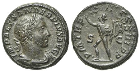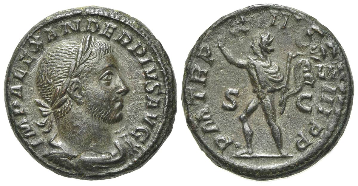 Severus Alexander (222-235), Sestertius, Rome, AD 235; AE (g 12.02; mm 25; h 12). IMP ALEXANDER PIVS AVG, Laureate, draped and cuirassed bust r.; Rv. P M TR P XIII COS III P P, Sol advancing l., raising hand and holding whip. RIC