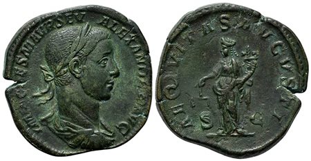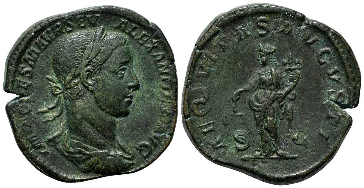 Severus Alexander (222-235), Sestertius, Rome, AD 226. AE (g 21,36; mm 32; h 12). IMP CAES M AVR SEV ALEXANDER AVG, Laureate, draped and cuirassed bust r.; Rv. AEQVITAS AVGVSTI, Aequitas standing l., holding scales and cornucopia,