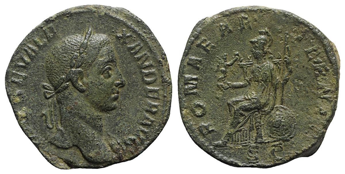Severus Alexander (222-235), Sestertius, Rome, AD 228. AE (g 22,16; mm 30; h 12). IMP SEV ALEXANDER AVG, Laureate bust r., drapery on l. shoulder; Rv. ROMAE AETERNAE, Roma seated l. on shield, holding Victory and sceptre, S C. RIC 605. Green patina, some roughness on rev., about very fine