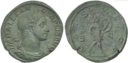 Severus Alexander (222-235), Sestertius, Rome, 231-5. AE (g 18,12; mm 31; h 12). IMP ALEXANDER PIVS AVG, Laureate, draped and cuirassed bust r., Rv. MARS VLTOR, Mars advancing r., holding spear and shield, S - C. RIC 635d. Green patina, good very fine