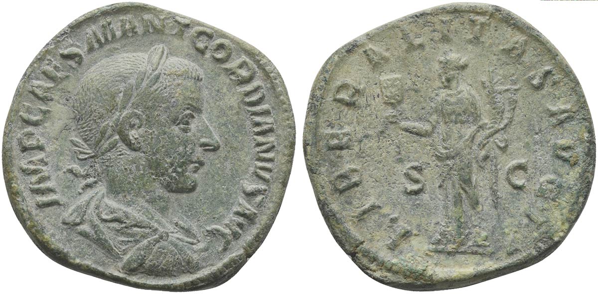 Gordian III (238-244), Sestertius, Rome, AD 239. AE (g 21,22; mm 31; h 12). IMP CAES M ANT GORDIANVS AVG, Laureate, draped and cuirassed bust r., Rv. LIBERALITAS AVG II, Liberalitas standing l., holding abacus and double cornucopi