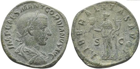 Gordian III (238-244), Sestertius, Rome, AD 239. AE (g 21,22; mm 31; h 12). IMP CAES M ANT GORDIANVS AVG, Laureate, draped and cuirassed bust r., Rv. LIBERALITAS AVG II, Liberalitas standing l., holding abacus and double cornucopia, S - C. RIC 269a. Green patina, very fine - good very fine