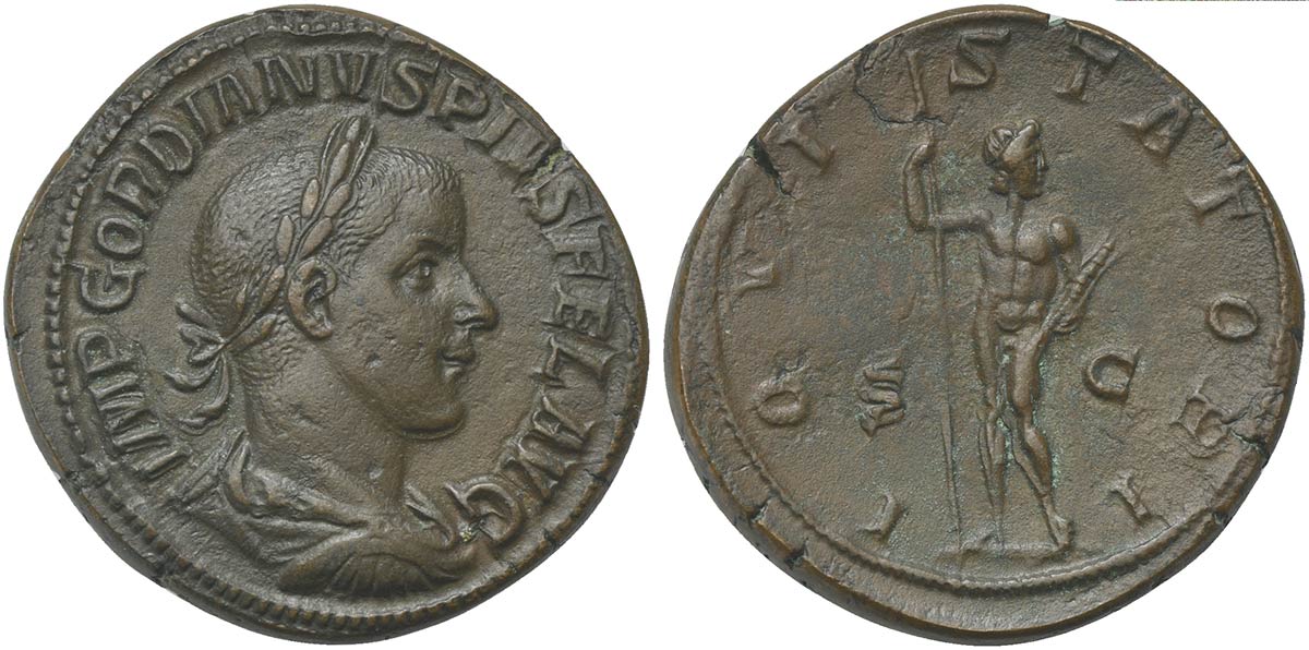 Gordian III (238-244), Sestertius, Rome, 241-3. AE (g 19,05; mm 32; h 12). IMP GORDIANVS PIVS FEL AVG, Laureate, draped and cuirassed bust r., Rv. IOVI STATORI, Jupiter standing r., holding sceptre and thunderbolt. RIC 298a. Near extremely fine