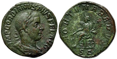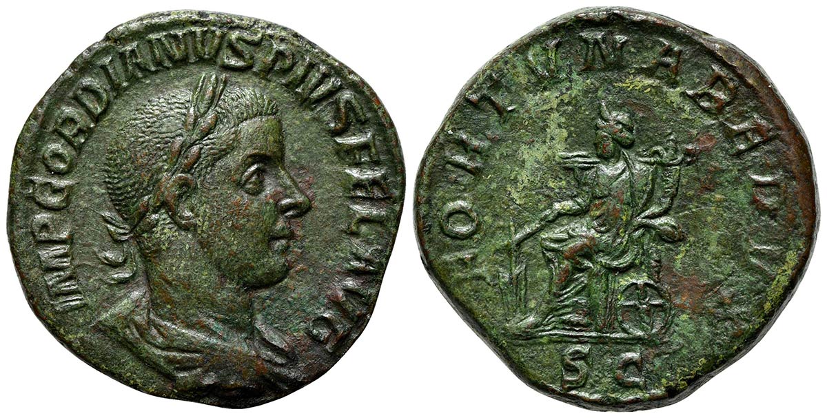 Gordian III (238-244), Sestertius, Rome, 243-4. AE (g 21,40; mm 30; h 1). IMP GORDIANVS PIVS FEL AVG, Laureate, draped and cuirassed bust r.; Rv. FORTVNA REDVX, Fortuna seated l., holding rudder and cornucopia; wheel beside throne