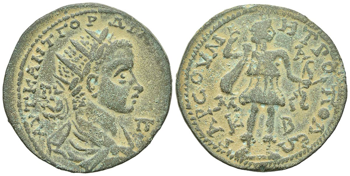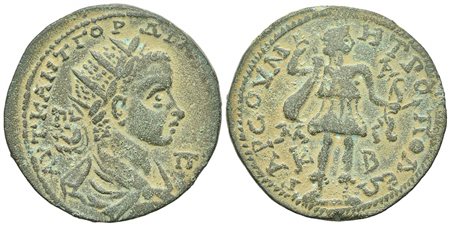 Gordian III (238-244), Cilicia, Tarsus. AE (g 19,84; mm 34,5; h 6). AVT K ANT ΓOPΔIA[OC CEB], Radiate, draped and cuirassed bust r.; Rv. TAPCOV MHTPOΠOΛЄΩ, Artemis standing r., drawing arrow from quiver with r. hand, holding bow in l.; -A/M-Γ/K-B in fields. Cf. SNG BnF 1665; SNG Levante Suppl. 285. Green patina, good very fine