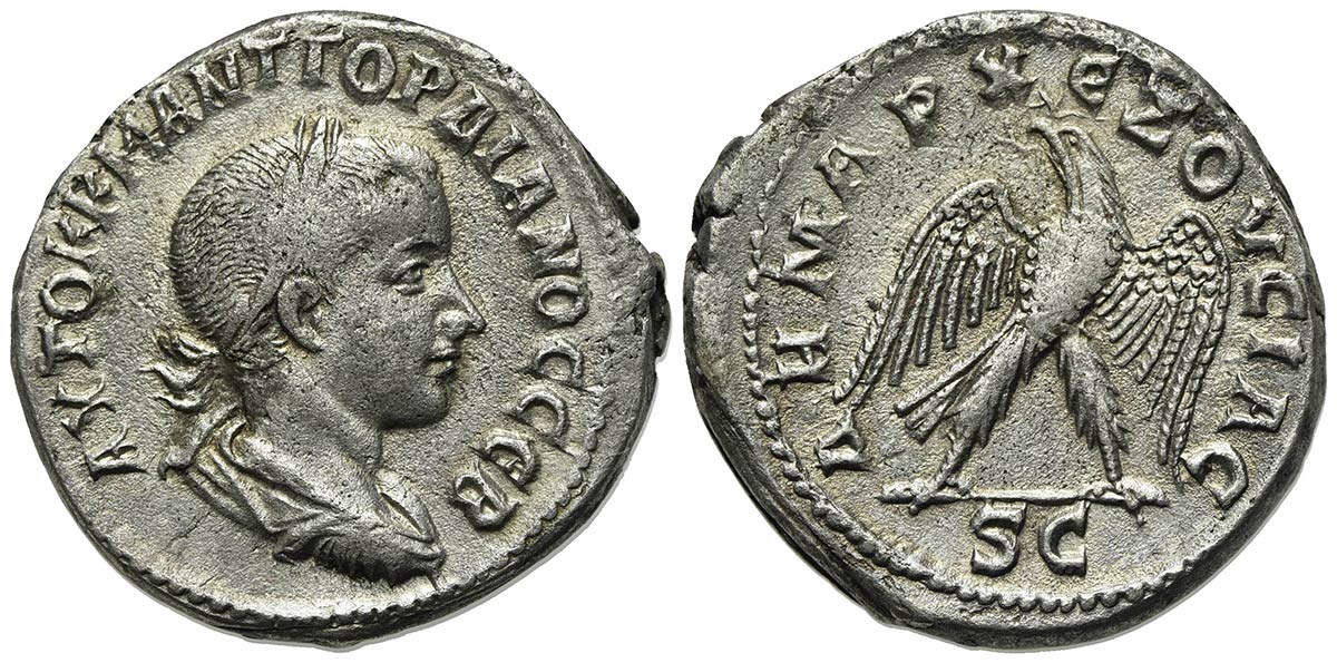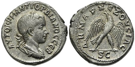 Gordian III (238-244), Tetradrachm, Seleucis and Pieria, Antioch, AD 238-240. AR (g 11,56; mm 26,5; h 12). AYTOK K M ANT ΓOPΔIANOC CЄB, Laureate, draped and cuirassed bust r.; Rv. ΔHMAPX ЄZOVCIAC, Eagle standing facing, head l., with wreath in beak and wings spread. McAlee 860; Prieur 282. Good very fine