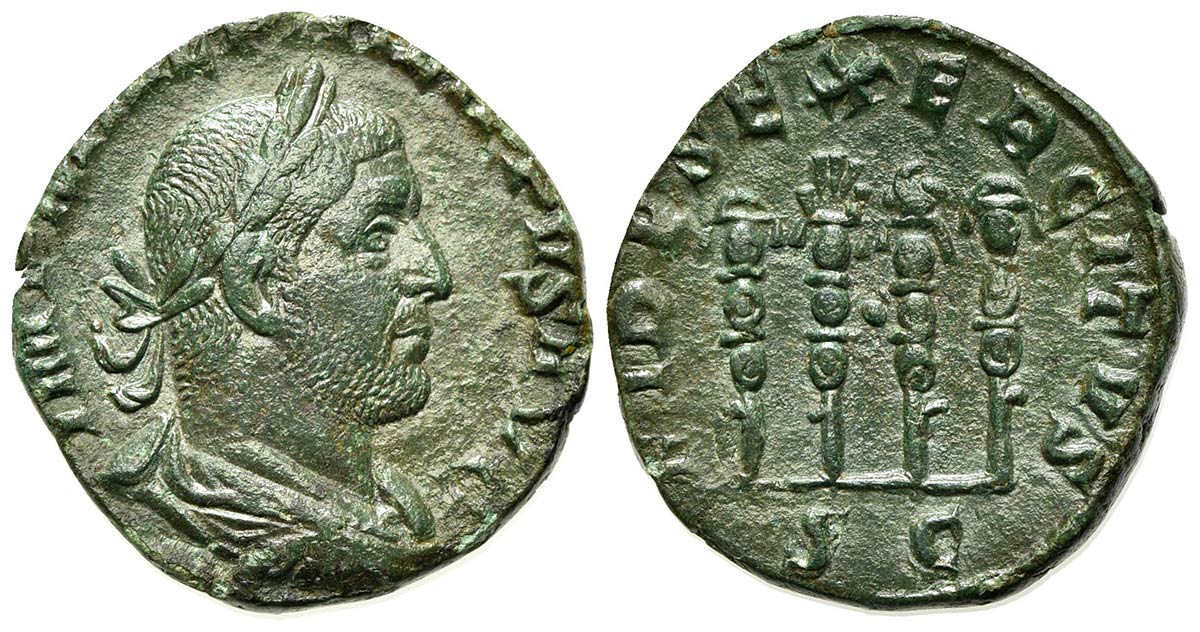 Philip I (244-249), Sestertius, Rome, 244-9. AE (g 13,81; mm 26,5; h 12). IMP M IVL PHILIPPVS AVG, Laureate, draped and cuirassed bust r., seen from behind; Rv. FIDES EXERCITVS, Four standards, S - C. RIC 171a. Green patina, good