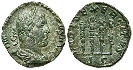Philip I (244-249), Sestertius, Rome, 244-9. AE (g 13,81; mm 26,5; h 12). IMP M IVL PHILIPPVS AVG, Laureate, draped and cuirassed bust r., seen from behind; Rv. FIDES EXERCITVS, Four standards, S - C. RIC 171a. Green patina, good very fine