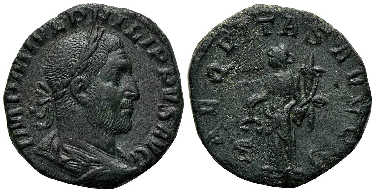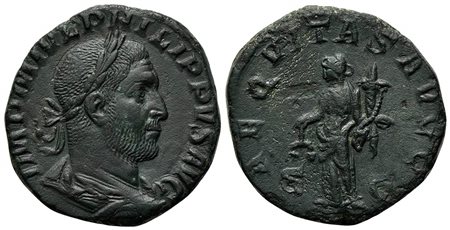 Philip I (244-249), Sestertius, Rome, AD 246. AE (g 14,97; mm 27; h 1). IMP M IVL PHILIPPVS AVG, Laureate, draped and cuirassed bust r.; Rv. AEQVITAS AVGG, Aequitas standing l., holding scales and cornucopia, S - C. RIC 166a. Scratch on rev., extremely fine / good very fine