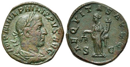 Philip I (244-249), Sestertius, Rome, AD 246. AE (g 17,17; mm 27; h 12). IMP M IVL PHILIPPVS AVG, Laureate, draped and cuirassed bust r.; Rv. AEQVITAS AVGG, Aequitas standing l., holding scales and cornucopia, S - C. RIC 166a. Good very fine