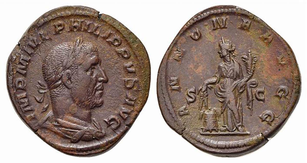 Philip I (244-249), Sestertius, Rome, AD 246. AE (31mm, 20.06g, 6h). IMP M IVL PHILIPPVS AVG, Laureate, draped and curiassed bust r.; Rv. ANNONA AVGG, Annona standing l., holding cornucopia and grain ears; modius filled with grain