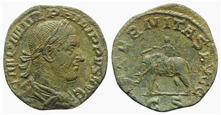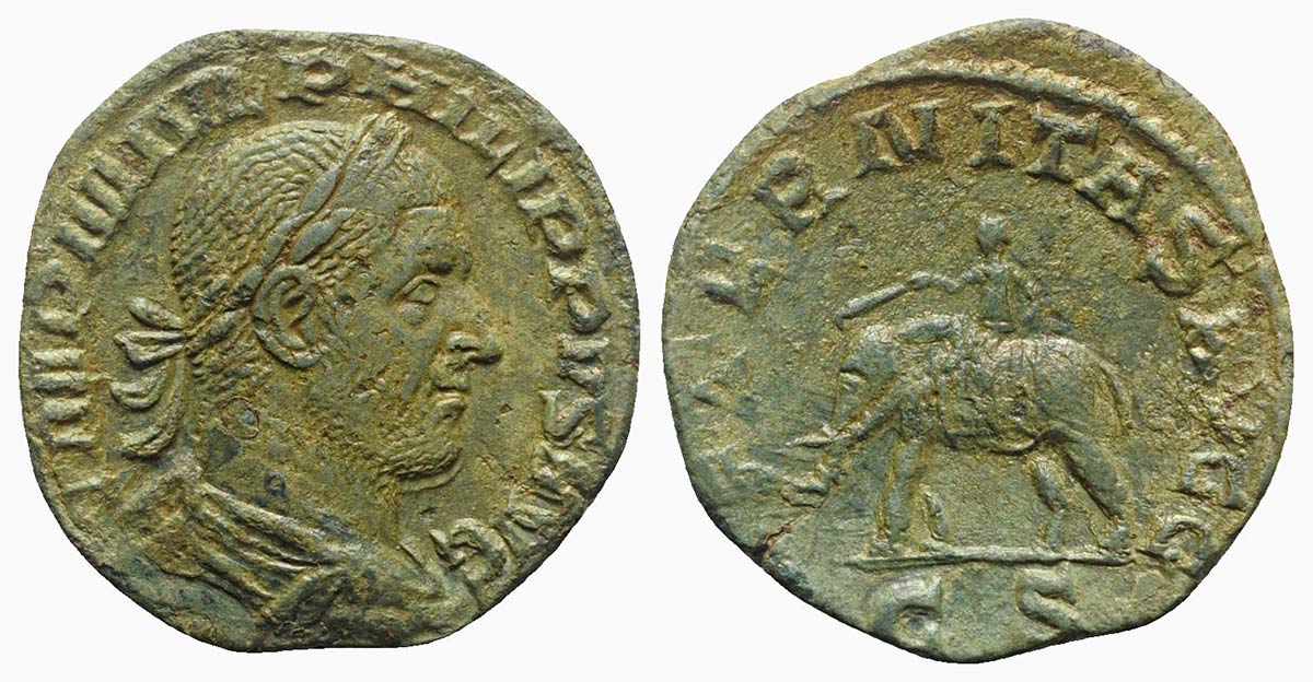 Philip I (244-249), Sestertius, Rome, 248-9. AE (g 16,14; mm 27; h 12). IMP M IVL PHILIPPVS AVG, Laureate, draped and cuirassed bust r.; Rv. AETERNITAS AVGG, Elephant walking l., guided by mahout with goad and wand, C S. RIC 167a. Engraver’s error with CS, not SC, on the reverse. Green patina, near very fine