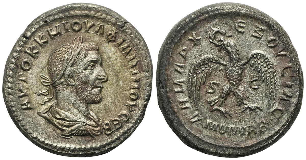 Philip I (244-249). Seleucis and Pieria, Antioch, Tetradrachm, AD 249. BI (g 14,74; mm 27; h 7). AYTOK K M IOYΛ ΦIΛIΠΠOY CEB, Laureate, draped and cuirassed bust r.; Rv. ΔHMAPK EΞOYCIAC, Eagle standing r., with wings spread, holdi
