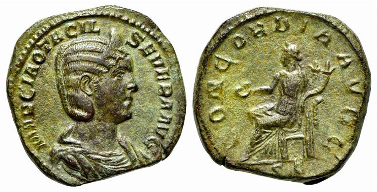 Otacilia Severa (Augusta, 244-249), As, Rome, AD 246. AE (g 10,90; mm 25; h 12). MARCIA OTACIL SEVERA AVG, Draped bust r., wearing stephane; Rv. CONCORDIA AVGG, Concordia seated l., holding patera and double cornucopia, S - C. RIC