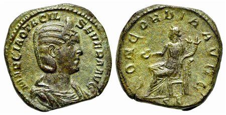 Otacilia Severa (Augusta, 244-249), As, Rome, AD 246. AE (g 10,90; mm 25; h 12). MARCIA OTACIL SEVERA AVG, Draped bust r., wearing stephane; Rv. CONCORDIA AVGG, Concordia seated l., holding patera and double cornucopia, S - C. RIC 203b (Philip I). Green patina, good very fine