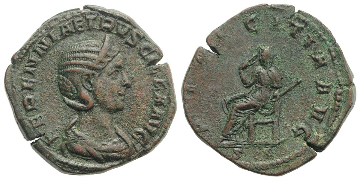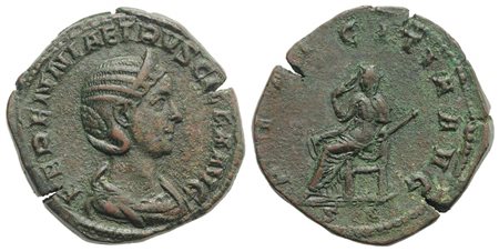 Herennia Etruscilla (Augusta, 249-251), Sestertius, Rome, AD 250. AE (g 20.04, mm 31, h 12). HERENNIA ETRVSCILLA AVG, Draped bust r., wearing stephane; Rv. PVDICITIA AVG, Pudicitia seated l., drawing veil and holding sceptre. RIC