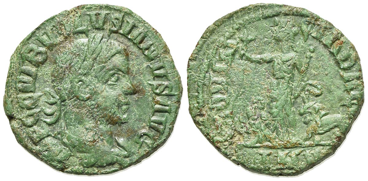 Volusian (251-253), Province of Dacia. AE (g 9,89; mm 25; h 6), year 5 (AD 249/250). Laureate, draped and cuirassed bust r., seen from behind; Rv. Dacia standing l., holding branch and sceptre, emblems of legions V (eagle) and XIII (lion) at her feet to the l. and r. RPC IX 110; AMNG 54. Green patina, near very fine