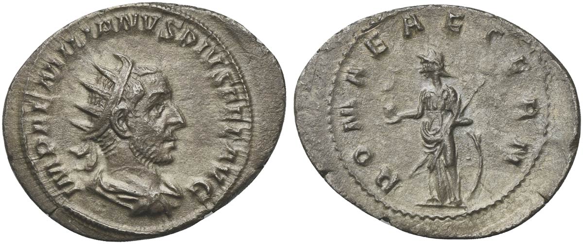 Aemilian (AD 253), Antoninianus, Rome. AE (g 2,93; mm 26; h 12). IMP AEMILIANVS PIVS FEL AVG, Radiate, draped and cuirassed bust r., Rv. ROMAE AETERN, oma standing l., holding phoenix on globe and sceptre; behind, shield to r. RIC 9; RSC 41. Near extremely fine