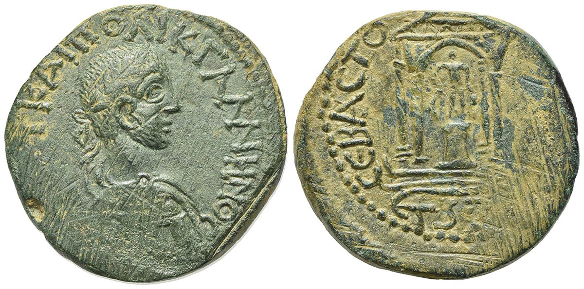 Lotto 1497 | Gallienus (253-268), Pontus, Sebastopolis. AE (g 14,80; mm 29; h 1), year 266 (AD 263/4). AYT KAI ΠO ΛIK ΓAΛΛIHNOC, Laureate, draped and cuirassed bust r. Rv., CEBACTO[ΠO HPAKΛEOΠO], Tetrastyle temple containing statue of Herakles