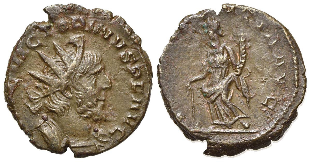 Victorinus (269-271), Antoninianus, Colonia Agrippinensis, AD 271. AE (g 3,04; mm 18; h 6). IMP C VICTORINVS P F AVG, Radiate head r.; Rv. PROVIDENTIA AVG, Providentia standing facing, head l., holding baton and cornucopia; globe