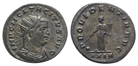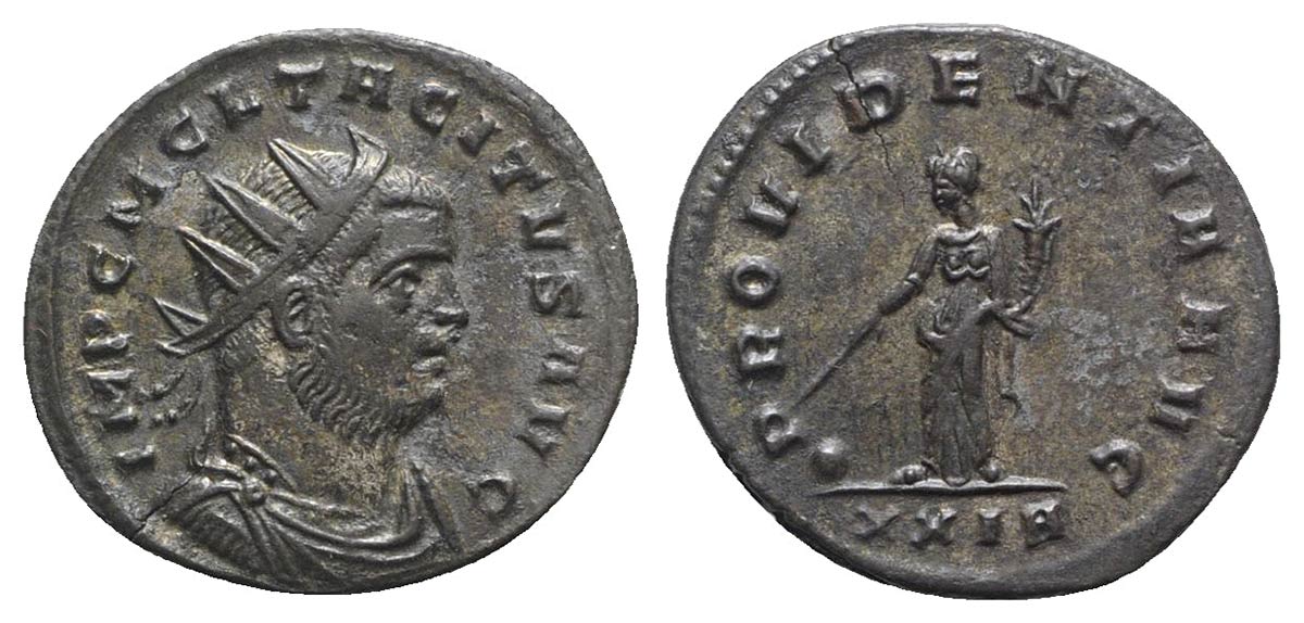 Tacitus (275-276), Antoninianus, Rome, AD 275. AR (g 3,60; mm 21; h 6). IMP C M C L TACITVS AVG, Radiate, draped and cuirassed bust r.; Rv. PROVIDENTIA AVG, Providentia standing l. holding baton over globe at foot l. and cornucopi