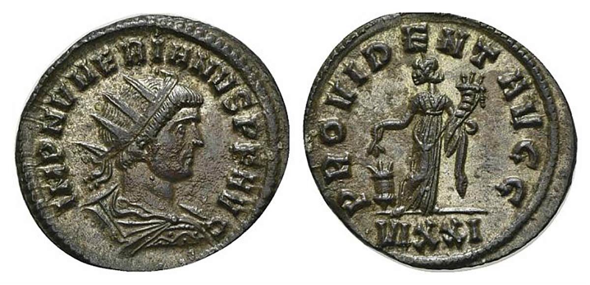Numerian (283-284), Antoninianus, Ticinum, AD 283 (g 3,52; mm 23,5; h 6). IMP NVMERIANVS P F AVG, Radiate, draped and cuirassed bust r.; Rv. PROVIDENT AVGG, Providentia standing l., holding cornucopia and grain ears over modius to