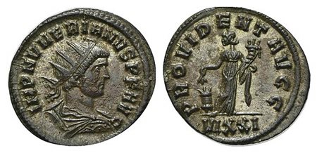 Numerian (283-284), Antoninianus, Ticinum, AD 283 (g 3,52; mm 23,5; h 6). IMP NVMERIANVS P F AVG, Radiate, draped and cuirassed bust r.; Rv. PROVIDENT AVGG, Providentia standing l., holding cornucopia and grain ears over modius to l.; VIXXI. RIC 447. Good very fine
