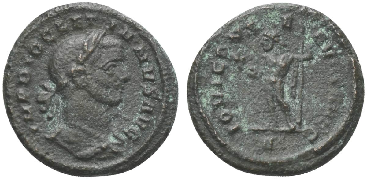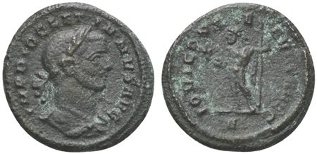 Diocletian (284-305). Quinarius, Rome, AD 285. AE (g 2,14; mm 15; h 11). IMP DIOCLETIANVS AVG, Laureate and draped bust r., Rv. IOVI CONSERVATORI AVG, Jupiter standing l., holding thunderbolt and sceptre; Δ in exergue. RIC 194. Near very fine