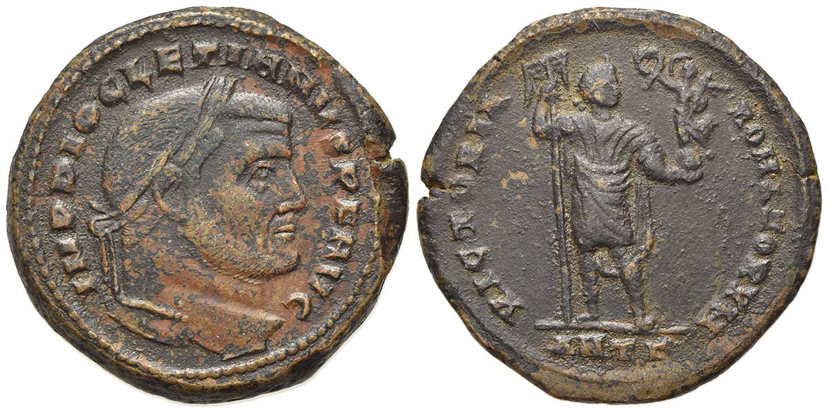 Diocletian (284-305), Follis, Antioch. AE (g 14,80; mm 28; h 12). IMP DIOCLETIANVS P F AVG, Laureate head r.; Rv. VICTORIA ROMANORVM, Emperor standing facing, head r., holding labarum and victory on globe; ANTΓ. RIC -. Extremely R