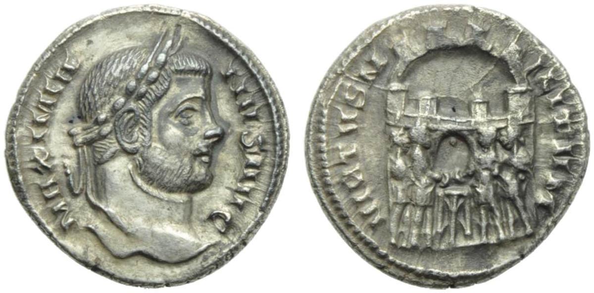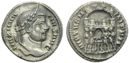 Maximianus (286-310), Argenteus, Siscia, ca. AD 294-295. AR (g 3,41; mm 18; h 12). MAXIMIA - NVS AVG, laureate head r., Rv. VIRTVS M - ILITVM, eight-turreted camp gate in front of which the four tetrarchs swear over tripod. RIC 46b. Cabinet tone, minor cleaning marks, extremely fine.