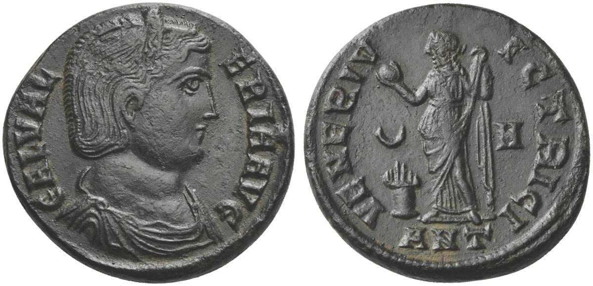 Galeria Valeria (Augusta, 293(?)-311), Follis, Antioch, 310-1. AE (g 7,36; mm 22; h 11). GAL VALERIA AVG, Diademed and draped bust r., Rv. VENERI VICTRICI, Venus standing facing, head l., lifting dress and holding apple; crescent/