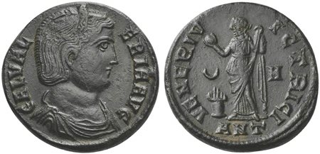 Galeria Valeria (Augusta, 293(?)-311), Follis, Antioch, 310-1. AE (g 7,36; mm 22; h 11). GAL VALERIA AVG, Diademed and draped bust r., Rv. VENERI VICTRICI, Venus standing facing, head l., lifting dress and holding apple; crescent/H//ANT. RIC 151. Extremely fine