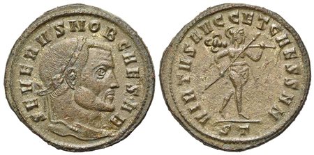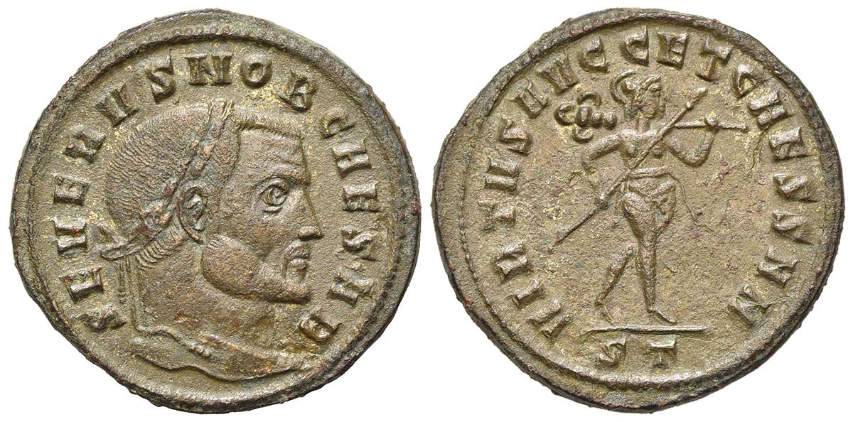Severus II (Caesar, 305-306), Follis, Ticinum. AE (g 9.15; mm 28; h 6). SEVERVS NOB CAESAR, Laureate head r.; Rv. VIRTVS AVG CET CAESS NN, Virtus walking r., holding spear and trophy over shoulder; ST. RIC 58a. Near extremely fine