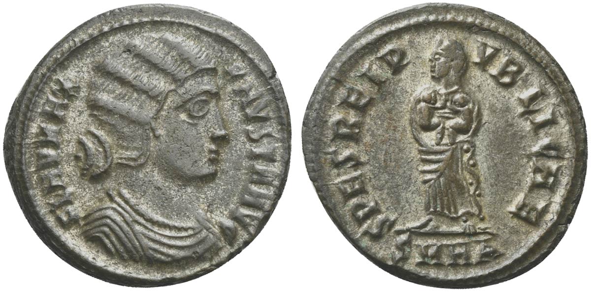 Lotto 1540 | Fausta (Augusta, 324-326), Follis, Heraclea, 327-9. AE (g 3,37; mm 19; h 6). FLAV MAX FAVSTA AVG, Draped bust r., wearing necklace, Rv. SPES REIPVBLICAE, Salus or Fausta standing l., holding two infants in her arms; SMHA. RIC 80.