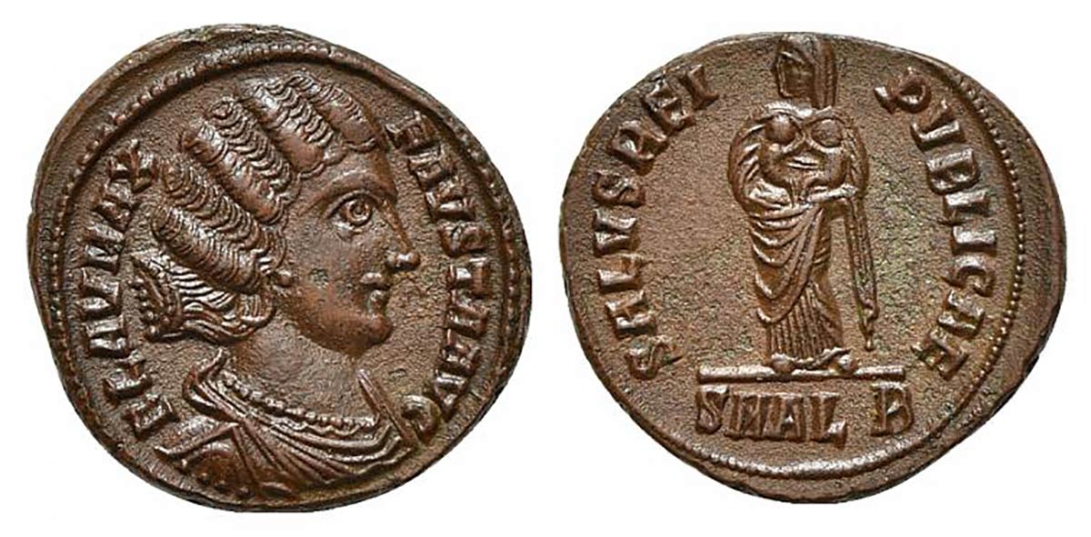 Fausta (Augusta, 324-326), Follis, Alexandria, 325-6. AE (g 3,24; mm 19,5; h 11). FLAV MAX FAVSTA AVG, Pearl-diademed, draped bust r., wearing a pearl necklace; Rv. SALVS REI PVBLICAE, Empress standing facing, head l., holding two