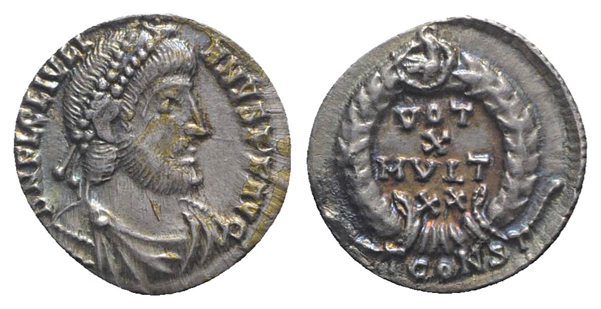 Julian II (360-363), Siliqua, Arelate, 362-3. AR (g 2,11; mm 16; h 6). D N FL IVLI ANVS P F AVG, Pearl-diademed, draped and cuirassed bust r.; Rv. VOT/X/MVLT/XX in four lines within wreath; eagle in medallion in centre of wreath;