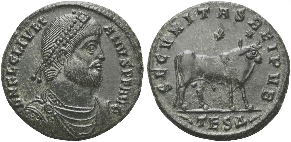 Julian II (360-363), AE, Thessalonica, 361-3. AE (g 8,70; mm 28; h 5). D N FL CL IVLI-ANVS P F AVG, Pearl-diademed, draped and cuirassed bust r., Rv. SECVRITAS REI PVB, Bull standing r.; two stars above; palm-TES∆-palm. RIC 225. G