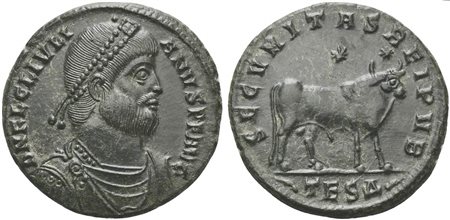 Julian II (360-363), AE, Thessalonica, 361-3. AE (g 8,70; mm 28; h 5). D N FL CL IVLI-ANVS P F AVG, Pearl-diademed, draped and cuirassed bust r., Rv. SECVRITAS REI PVB, Bull standing r.; two stars above; palm-TES∆-palm. RIC 225. G