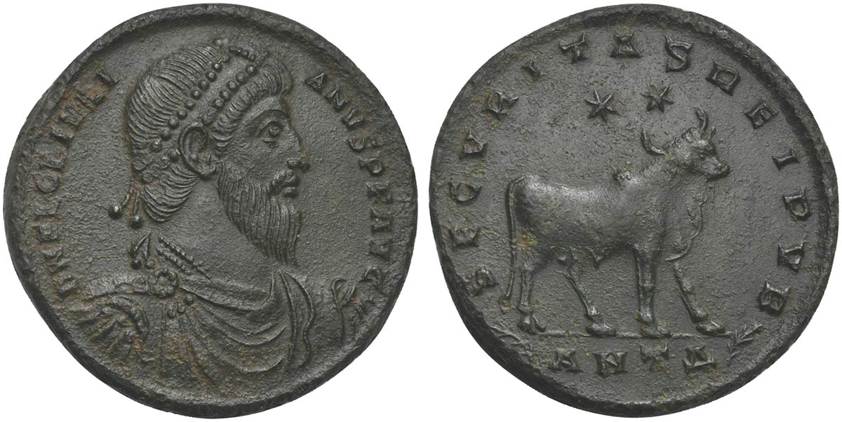 Julian II (360-363), AE, Thessalonica, 361-3. AE (g 8,30; mm 27; h 5). D N FL CL IVLI-ANVS P F AVG, Pearl-diademed, draped and cuirassed bust r., Rv. SECVRITAS REI PVB, Bull standing r.; two stars above; palm-TES∆-palm. RIC 225. E