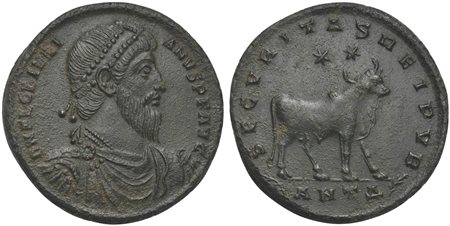 Julian II (360-363), AE, Thessalonica, 361-3. AE (g 8,30; mm 27; h 5). D N FL CL IVLI-ANVS P F AVG, Pearl-diademed, draped and cuirassed bust r., Rv. SECVRITAS REI PVB, Bull standing r.; two stars above; palm-TES∆-palm. RIC 225. E