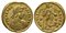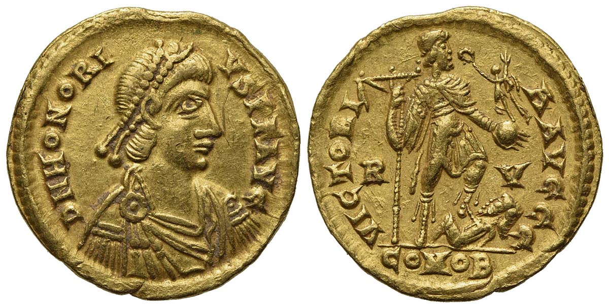 Honorius (393-423), Solidus, Ravenna, 402-6. AV (g 4,48, mm 21, h 12). D N HONORIVS P F AVG, Pearl-diademed, draped and cuirassed bust r.; Rv. VICTORIA AVGGG, Honorius standing r., spurning captive, holding labarum and Victory on
