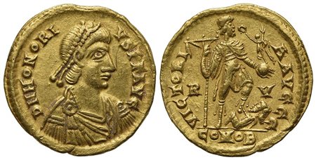 Honorius (393-423), Solidus, Ravenna, 402-6. AV (g 4,48, mm 21, h 12). D N HONORIVS P F AVG, Pearl-diademed, draped and cuirassed bust r.; Rv. VICTORIA AVGGG, Honorius standing r., spurning captive, holding labarum and Victory on globe; R-V//COMOB. RIC 1287d; Ranieri 12; Depeyrot 7/1. Good very fine