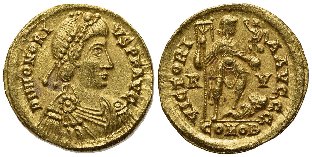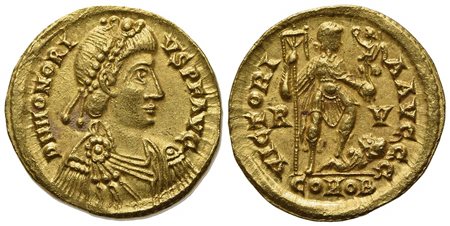 Lotto 1589 | Honorius (393-423), Solidus, Ravenna, 402-6. AV (g 4,48, mm 21, h 12). D N HONORIVS P F AVG, Pearl-diademed, draped and cuirassed bust r.; Rv. VICTORIA AVGGG, Honorius standing r., spurning captive, holding labarum and Victory on