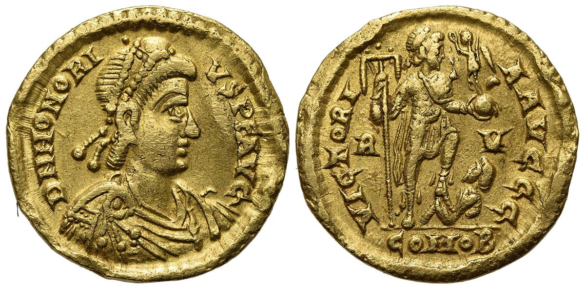 Honorius (393-423), Solidus, Ravenna, 402-6. AV (g 4,43, mm 21, h 6). D N HONORIVS P F AVG, Pearl-diademed, draped and cuirassed bust r.; Rv. VICTORIA AVGGG, Honorius standing r., spurning captive, holding labarum and Victory on g