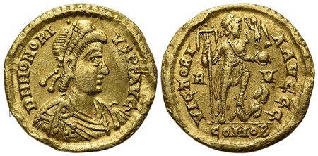 Honorius (393-423), Solidus, Ravenna, 402-6. AV (g 4,43, mm 21, h 6). D N HONORIVS P F AVG, Pearl-diademed, draped and cuirassed bust r.; Rv. VICTORIA AVGGG, Honorius standing r., spurning captive, holding labarum and Victory on globe; R-V//COMOB. RIC 1287d; Ranieri 12; Depeyrot 7/1. Very fine - good very fine