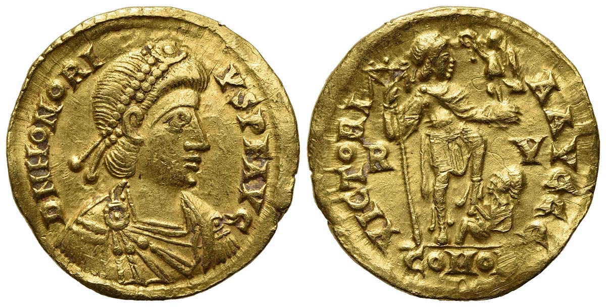 Honorius (393-423), Solidus, Ravenna, 402-6. AV (g 4,46, mm 20,5, h 12). D N HONORIVS P F AVG, Pearl-diademed, draped and cuirassed bust r.; Rv. VICTORIA AVGGG, Honorius standing r., spurning captive, holding labarum and Victory o