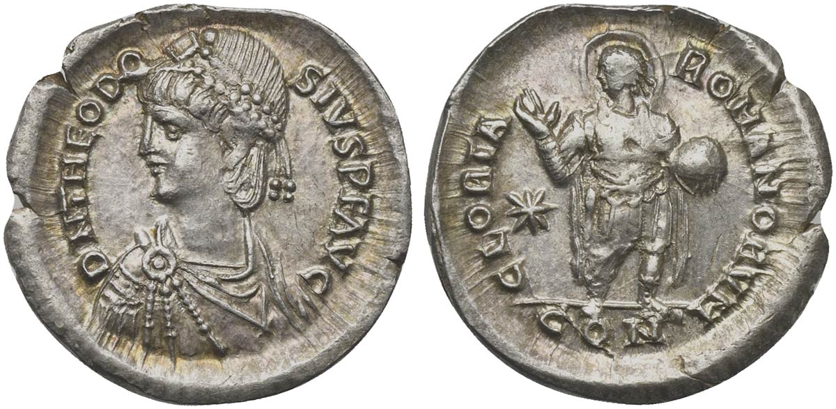 Theodosius II (408-450), light Miliarenses, Constantinople, 408-420 AD. AR (g 4,21; mm 22; h 12). D N THEODOSIVS P F AVG, pearl-diademed, draped and cuirassed bust l., Rv. GLORIA ROMANORUM, nimbate emperor standing facing, head l., arm raised and holding globe; on l., star; in ex. CON. RIC 370. Very rare. Lightly toned and about extremely fine.