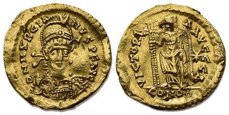 Marcian (450-457), Solidus, Constantinople. AV (g 4,45; mm 20; h 4). D N MARCIANVS P F AVG, Pearl-diademed, helmeted and cuirassed bust facing slightly r., holding spear and shield; Rv. VICTORIA AAVGGG, Victory standing l., holdin
